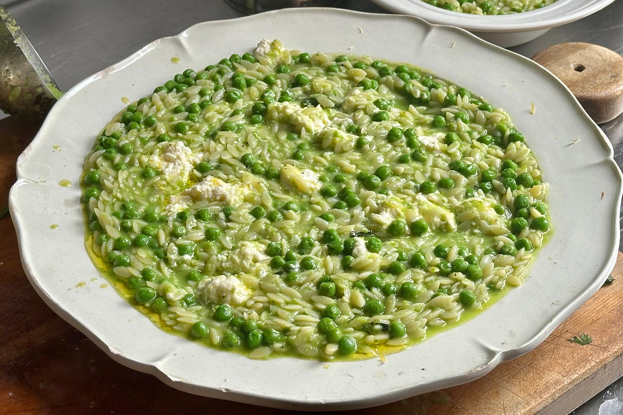 A soft green pot of peas and orzo